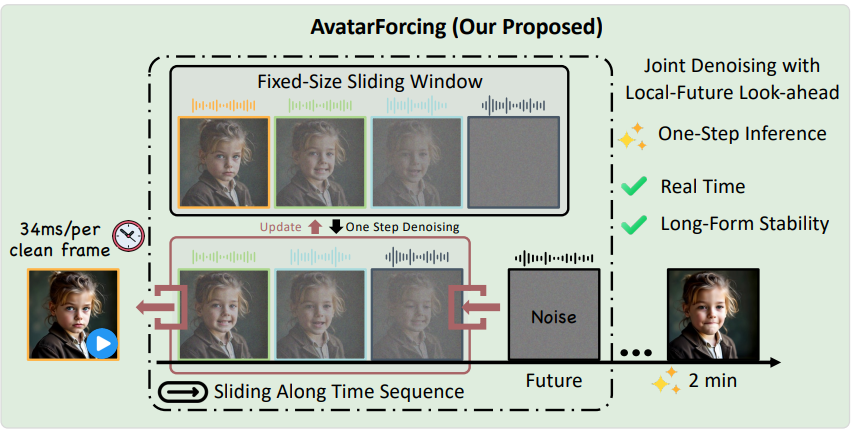 We introduce AvatarForcing, a one-step streaming diffusion framework for real-time talking avatar generation that delivers low-latency, temporally stable, and lip-synced long-form video synthesis at constant inference cost.