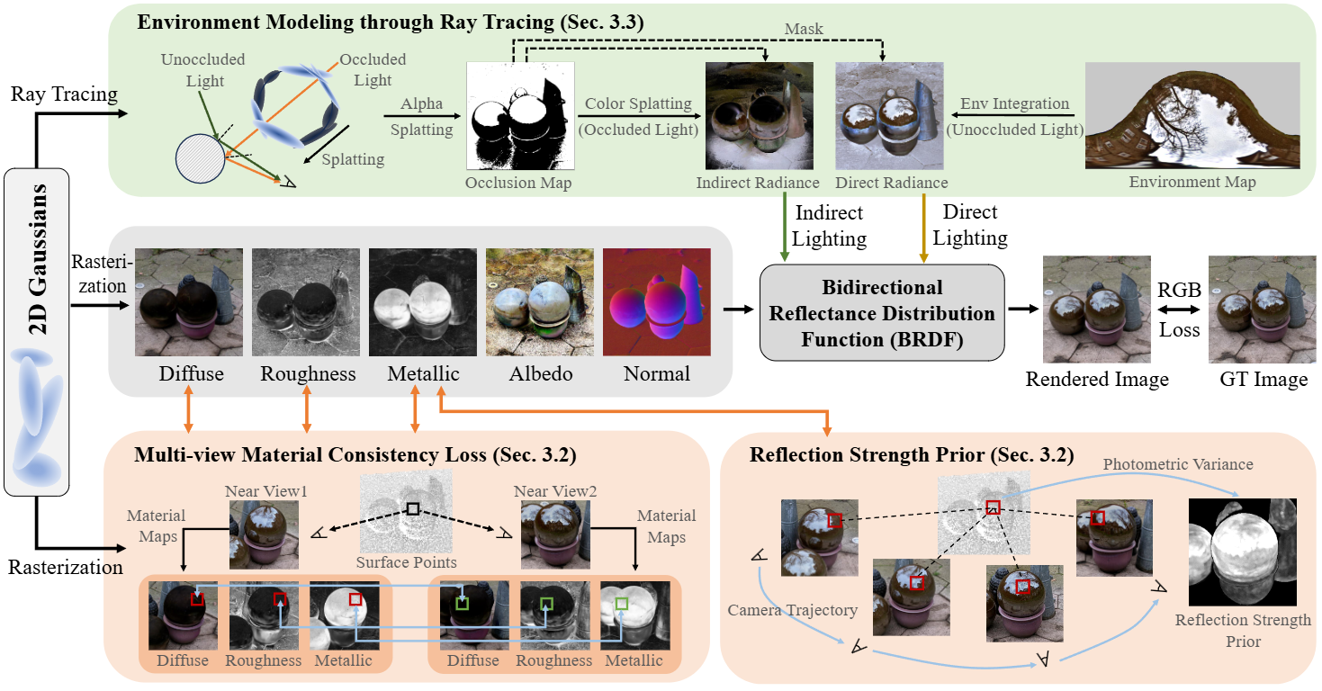 In addition, to compensate for inter-object reflections caused by self-occlusions, we introduce (c) environment modeling strategy based on 2DGS ray tracing. This enables the joint optimization of illumination and geometry.