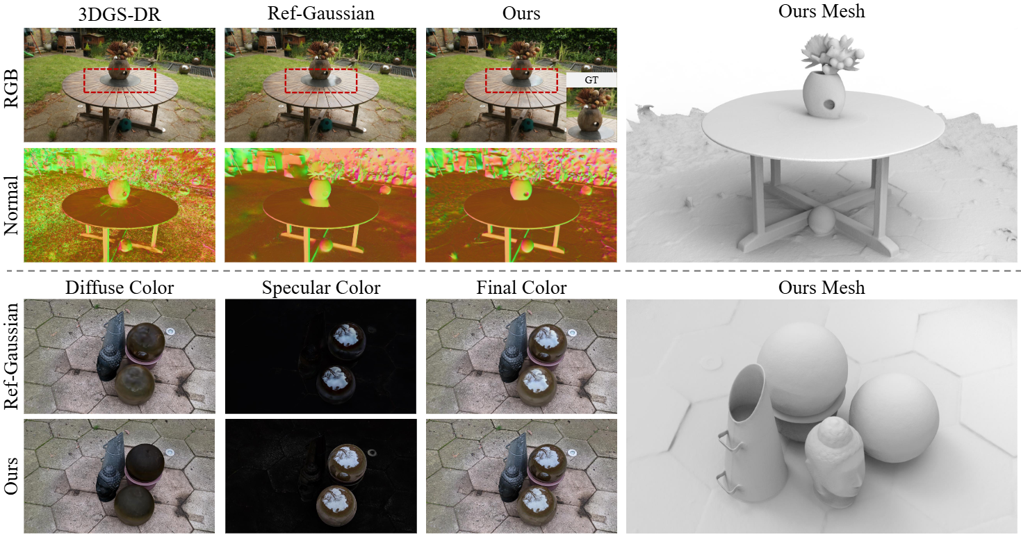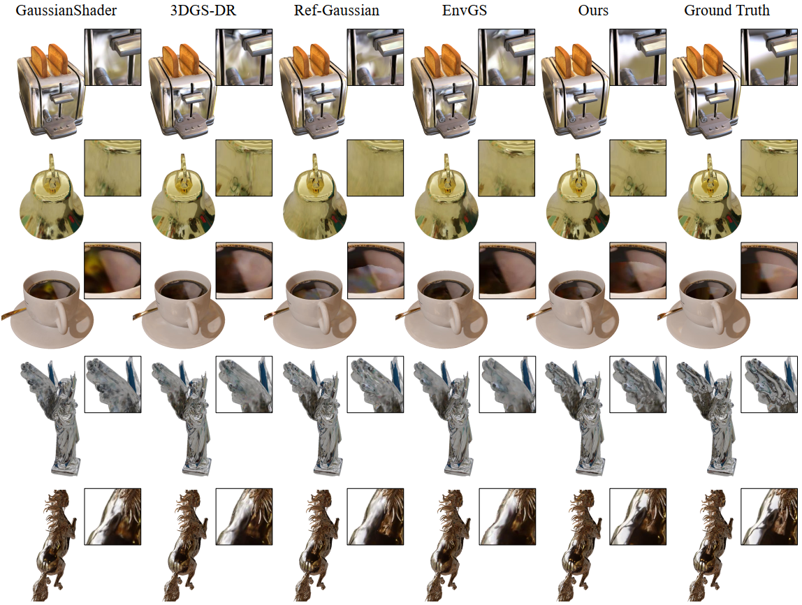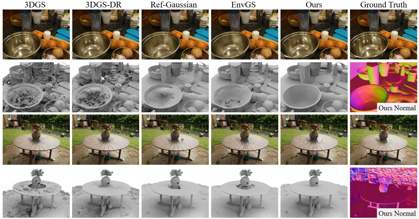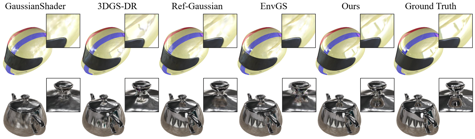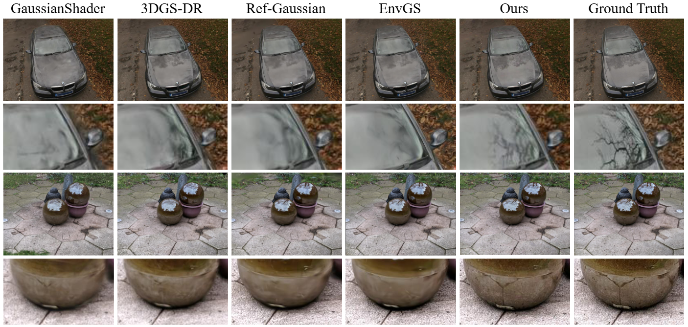 We evaluate our method on real-world Ref-Real dataset, where our method accurately reconstructs the reflection textures from the surrounding environments on highly reflective surfaces.